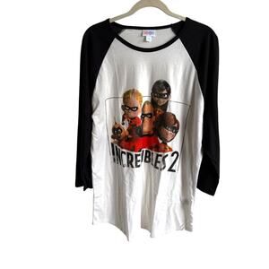 Stylish LuLaRoe top featuring Incredibles 2 graphic. Black sleeves with white body. Perfect for casual wear.
