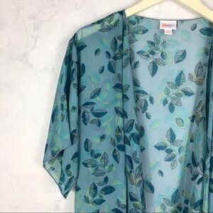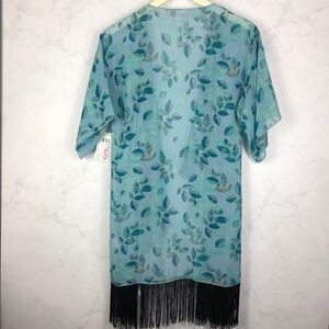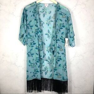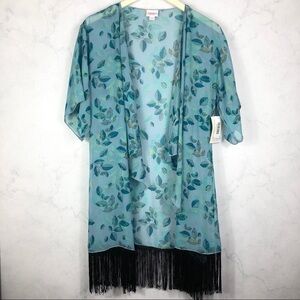 LuLaRoe Mint Blue / Green Leaf Kimono Cover Up Cardigan. Black Fringe Style. Monroe. No stains or rips. New w/ tags. Cute & Comfy. Lightweight & Loose.