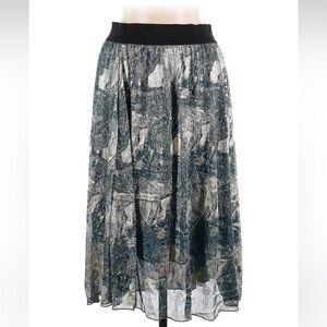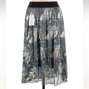 This LuLaRoe skirt showcases a stunning blend of gold and blue hues in a pleated A-line design, perfect for cocktail events or a night out. The midi length and metallic sheen add a touch of elegance, while the flowing fabric ensures a graceful silhouette.