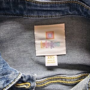 Stylish LuLaRoe cropped jean jacket. Features yellow embroidered detailing and chest pockets. Ideal for everyday wear.