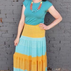 This LuLaRoe skirt features a flowing maxi length with a stylish A-line silhouette, perfect for casual or resort wear. The vibrant blue and orange colors are complemented by pleated and tiered details, adding a touch of elegance to its relaxed design. Ideal for warm weather, this skirt offers both comfort and a chic, eye-catching look.