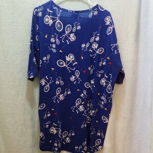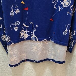 Vibrant blue top with white bicycle accents. Features a unique graphic design. Ideal for casual wear. Bicycles with yellow or red flags. Loose top.