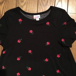 Black LuLaRoe Carly dress. Hi-lo hemline with short sleeves. Stretchy material with small pink roses and no chest pocket