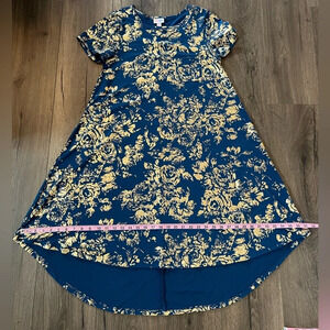 LuLaRoe Carly Dress Blue with Metallic Gold Floral Design Size Small