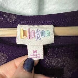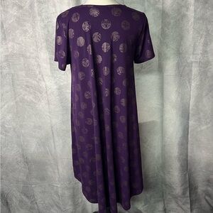 Elegant deep purple LuLaRoe Carly dress with a subtle polka dot with Aztec pattern. Short sleeves, high low hemline and classic design. Size medium. In excellent preowned condition! Measurements taken when dress is lying flat and are approximate.