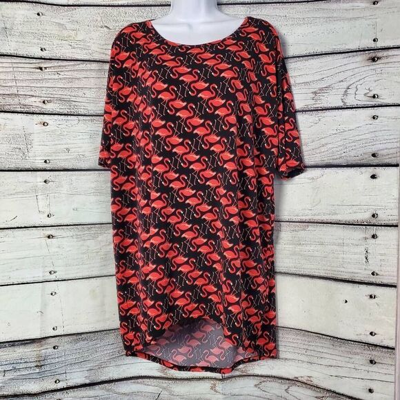 Fun and flattering LuLaRoe Carly dress in size Small with a bold black and red flamingo print. This swing dress features a high-low hem and soft stretchy fabric, making it perfect for casual wear, vacations, or layering.