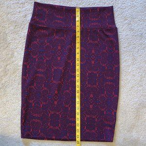 LuLaRoe Cassie Stretchy Pencil Skirt Damask Pattern in Red, Wine and Blue -Size