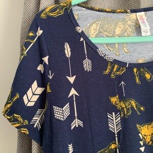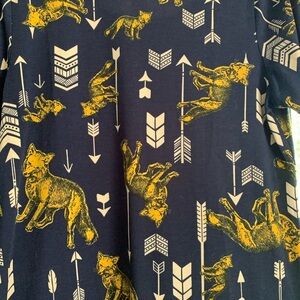Size medium scoop neck classic t from LuLaRoe. Navy blue with golden yellow wolves and cream colored arrows. In excellent, like new condition.