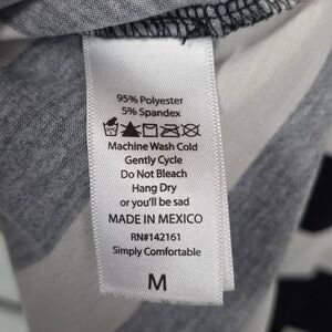 LuLaRoe women’s Classic Tee in size Medium featuring bold black and white horizontal stripes. Scoop neckline with short sleeves and a relaxed, comfortable fit. Hi-low hem adds extra coverage in back, making it easy to wear with leggings or jeans. Soft, stretchy polyester-spandex fabric that drapes well and feels lightweight. Made in Mexico. A versatile everyday basic that works year-round.
