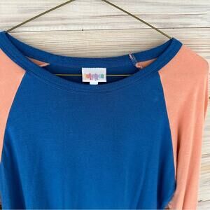never worn! This eye catching baseball tee from LuLaRoe has never been worn & is perfect for this time of year! You can pair this top with jeans, leggings, or sweats- super easy to dress up or down! And it’s extremely comfortable! You'll see a minor spot that's faded on the front- not noticeable when on, but the price takes that flaw into consideration.
