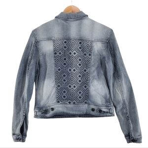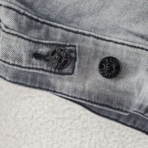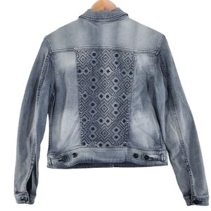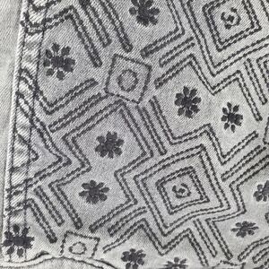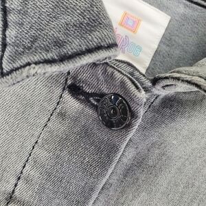 LuLaRoe Crop Jean Jacket M Gray Stretchy Denim Floral Embroidery Buttoned Fitted