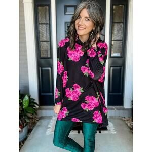 Features a beautiful bold pink floral print on a black background, long sleeves, and a relaxed tunic fit that’s easy to style with leggings, jeans, or skirts. Perfect for layering or wearing on its own!