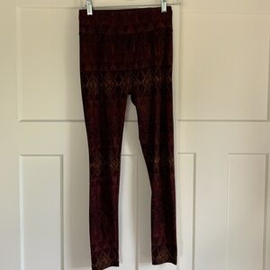 Stylish soft leggings with a geometric pattern. Features shades of burgundy and orange.