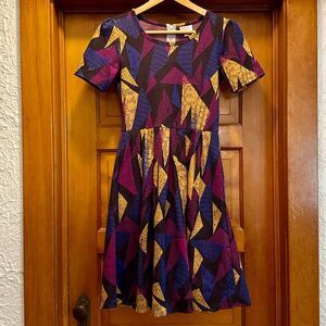 LuLaRoe Gold Black Purple Skater Dress Women’s US Extra Small