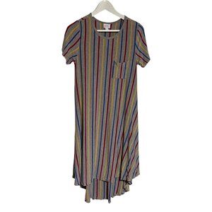 This LuLaRoe dress showcases a playful multicolor stripe pattern, offering a unique fashion statement. Crafted with quality materials, it features a comfortable high-low hem and a convenient chest pocket. Whether worn casually or in a professional setting, this dress elevates any wardrobe with its vibrant design and comfortable fit.