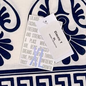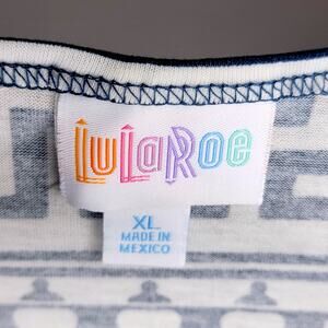 This LuLaRoe Classic T in XL features a bold navy and white Greek-inspired design with floral scrolls and key motifs, perfect for a standout look. Lightweight and versatile, itβs a statement piece for summer or year-round styling.