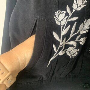 LuLaRoe Harvey Black Denim Crop Jacket with White Embroidered Roses Women’s Size M