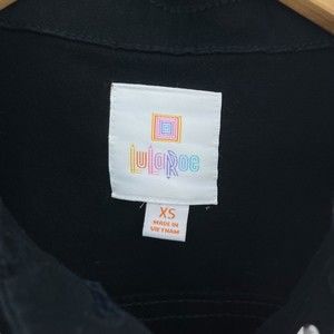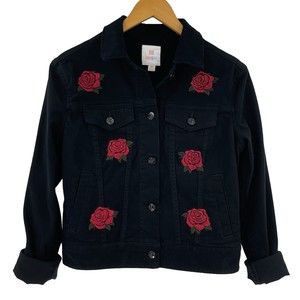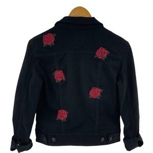 LuLaRoe Harvey Womens XS Black Stretch Jean Jacket Embroidered Red Roses Flowers