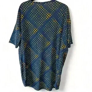 Keywords: LuLaRoe, women's tunic, multicolor, geometric pattern, oversized fit, hi-lo hemline, casual wear, relaxed fit, 2XS, pre-owned, versatile, comfortable, stylish, leggings, jeans.