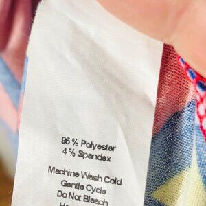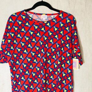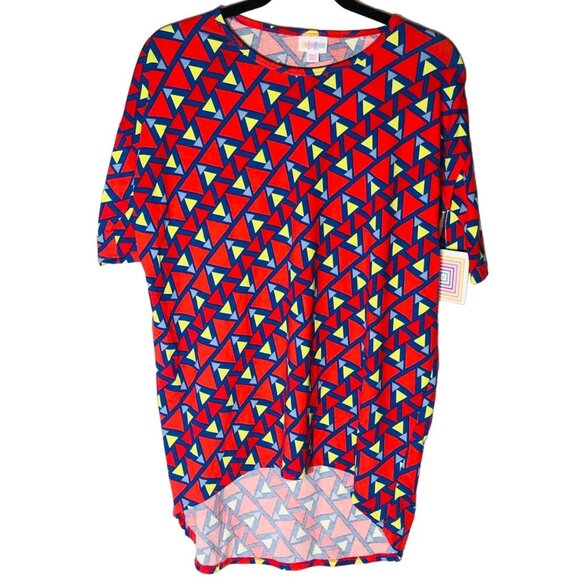 This vibrant LuLaRoe Irma tunic features a geometric design in red, yellow, and blue. Its relaxed fit and short sleeves make it perfect for casual wear.