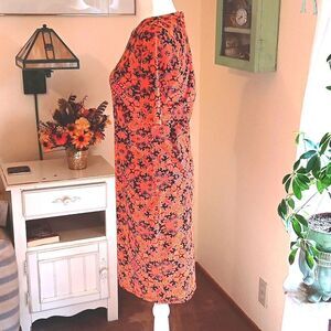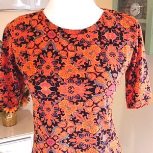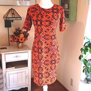 Made in the USA. I love this medieval floral pattern. Perfect for fall, rich browns and orange with pops of turquoise. Size S (6-8 ) Showing on my size 6 mannequin, measures 36 at chest, 34 at waist, 38 at hips, 34 at bottom hem for a perfect pencil shape. This is a beauty. Like NEW.