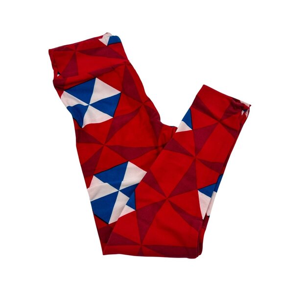 These colorful LuLaRoe leggings offer a unique geometric design in bold red, blue, and white. Crafted for comfort, their stretchable fabric ensures a snug, flexible fit for active kids.