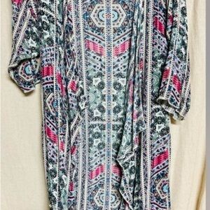 Add breezy style to any outfit with this LuLaRoe kimono, perfect for layering over a swimsuit, tank, or summer dress. Features a relaxed fit with beautiful tribal-inspired patterns in pink, aqua, and black.