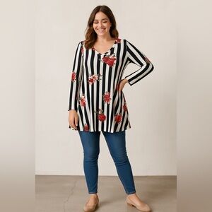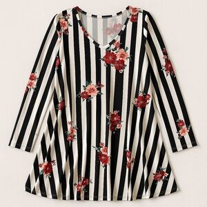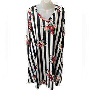 Chic and comfy LuLaRoe swing dress in size Large. Features bold black & white vertical stripes with a floral print in red, pink, and green for a striking contrast. Soft, stretchy, and flowy fabric with a flattering swing silhouette and V-neckline. Perfect to wear as a casual dress, layered tunic with leggings, or dressed up with heels and a belt.