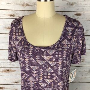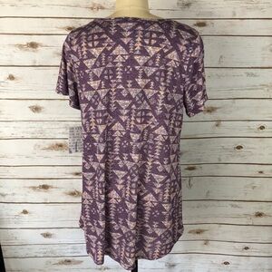 LuLaRoe Lavender Geometric Print Classic T is made from comfortable spun polyester jersey and is short sleeved with a round neck line. The Classic T pairs well with leggings as the back is slightly longer to flatter all body shapes and sizes. 50% polyester 50% rayon size Large #0049
