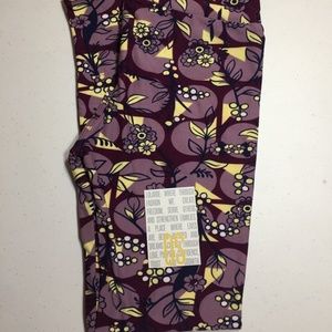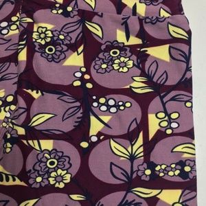 New with tags LuLaRoe Leggings full length size OS. These fit sizes 2-12. These have a purple, maroon, cream, and navy blue floral pattern.
