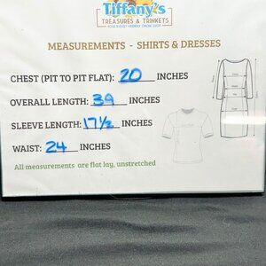 Chest (pit to pit flat) = 20 inches, Overall length = 39 inches, Sleeve length = 17.5 inches, Waist = 24 inches.