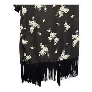 dd a touch of boho charm to any outfit! This LuLaRoe Monroe cardigan features a beautiful black base with white floral print and light, airy fabric that drapes effortlessly. Black fringe on bottom hem. Perfect for layering over tanks, tees, or dresses — whether you’re dressing up or keeping it casual.