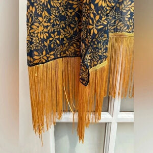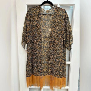 LuLaRoe | Monroe Gold Fringe & Navy Boho Floral Kimono Coverup Size L Large NWT