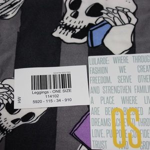 LuLaRoe OS Leggings! Brand new; never washed or worn! Super cute Halloween leggings with black and grey background and skulls using cellphones and laptops! These are so much fun!!!