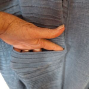 Blue, textured, front pockets, asymmetrical hemline, 3/4 Sleeve