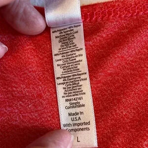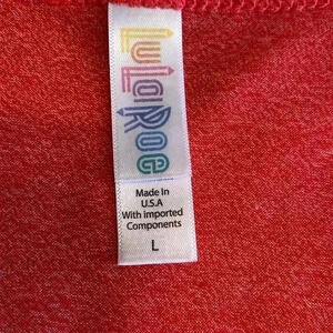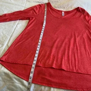 LuLaRoe Orange Heathered Long Sleeve High/Low Hem Large Tunic T-Shirt. Good pre owned condition. Area as shown in last photo that might be lightly discolored but I think it is just the fabric.