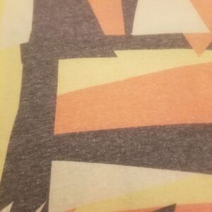 This Lula Roe Geometric Print Colorblock Perfect T is in excellent used condition. This short sleeved top is long enough to be worn as a shirt dress and the fit is relaxed. This colorblock top has a geometric print and is soft and cozy. It is a soft and cozy tunic style flare top. This artsy short sleeved shirt is really oversized and is lightweight and comfortable. This dopamine dressing top is super colorful and is in a salmon pink, yellow, grey and white and all of the colors are heathered.