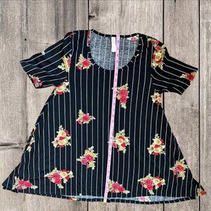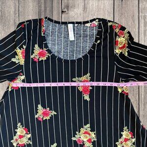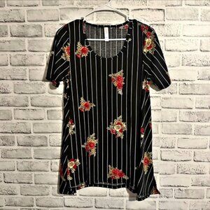 LuLaRoe Perfect Tee White Vertical Stripes Black w/ Red Green Gold Roses Size S