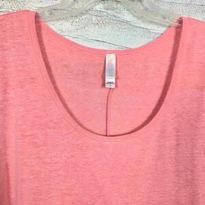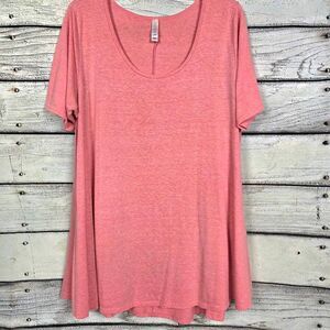 LuLaRoe women’s tunic top in size Large. Soft heathered pink with scoop neckline and short sleeves. Flowy swing silhouette for a relaxed, flattering fit that pairs perfectly with leggings or jeans.