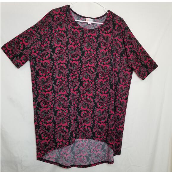 LuLaRoe Pullover Red Black Green Top Short Sleeves Round Neck Hi-Low Hem Size M