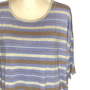 The Irma top is a loose, knit, high-low hem tunic, with fitted mid-length sleeves. With extra length in the back, the Irma is the perfect pairing partner to any leggings. Size large with blue and gray stripes.