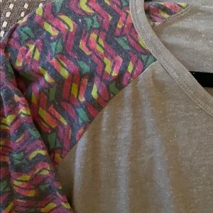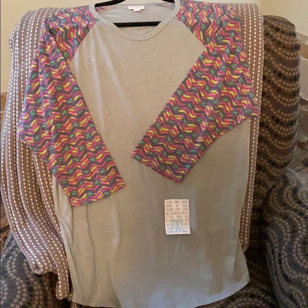 Brand new, never worn LuLaRoe Randy. Grey body with printed sleeves. Never worn.