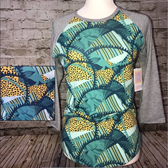 LuLaRoe Randy. Green pattern with gray sleeves. Available in size XXS.