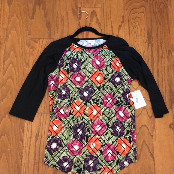 LuLaRoe Randy with orange and purple floral print and black sleeves