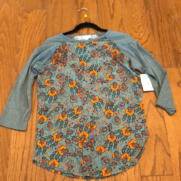 Blue LuLaRoe Randy with orange floral print and grey sleeves