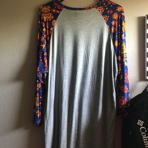 Solid gray body with fun royal blue/orange pattern on sleeves and collar!