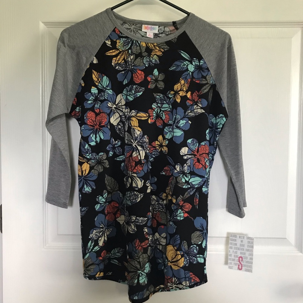 LuLaRoe Randy. Size small. New with tags. 3/4 sleeve. Dark navy background on body of shirt. Cross posted. Will happily accept any reasonable offer. Will also combine items!