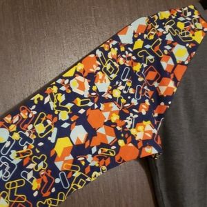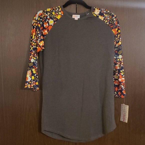 Small LuLaRoe Randy. Gray with navy sleeves. The designs has orange, yellow, mint and white.
