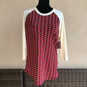 With LuLaRoe, comfort is key and we often liken our dresses and skirts to a t-shirt, in terms of their wearability and comfort. This unisex knit tee resembles a baseball tee with its raglan, mid-length sleeves—in a contrasting, patterned fabric. It is everything a t-shirt should be—stylish and comfortable.