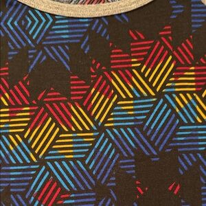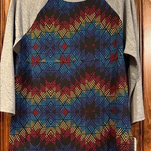 LuLaRoe women’s Randy raglan geometric tee. Size Large, Brand new with tags. Material 95% polyester 5% spandex. Stand out with this vibrant women's top featuring a geometric pattern in red, blue, and yellow. Perfect for adding a pop of color to your wardrobe.
